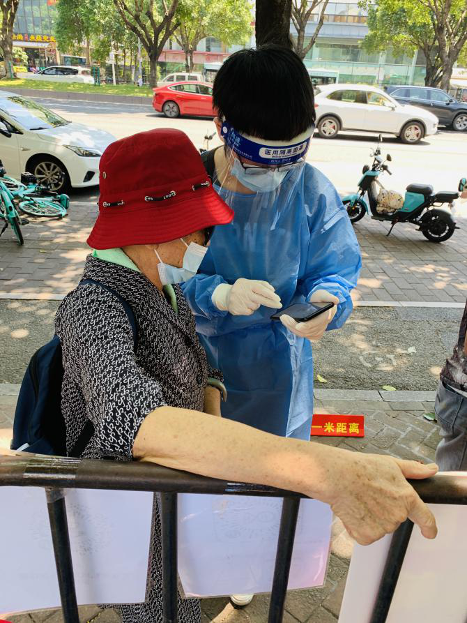 8月30日,在收到集团征集社区志愿服务者的一声号令后,突击队员们在微信群里纷纷接龙表示“我有24小时核酸结果,我先上”。有的队员在海珠区公共交通暂停的情况下,踩着单车走了5、6公里赶到服务点。全员核酸工作量大、时间长,有的小区多数是老人和小孩,排队过程中遇到好几个老人和小朋友都说:“太阳这么大,你们辛苦了!”听到这些话之后,我们的志愿者感觉很欣慰,流的汗水也都变成了动力。有一位志愿者在协助采样医护人员着装换岗的时候,匆忙中未来得及系上自己的蓝色防护服颈带,一旁安静等候检测队伍中,突然有一人走出队伍上前,提醒并主动帮他系紧颈带,一个轻轻的举动,系紧的是志愿者和广大市民们团结抗疫的坚强纽带。