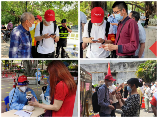在小洲村大宗祠核酸检测点,外来人口2000多人,村委工作压力很大,户外露出 志愿者组团抵达以后,迅速与社区沟通,以“流水线”作业方式帮助建立2个扫码专点,在各个检测点协助群众有序检测,获得村委高度称赞:“疫情发生以来,村里从未见过有如此有爱心的团队。我们只认你们的红帽子!”